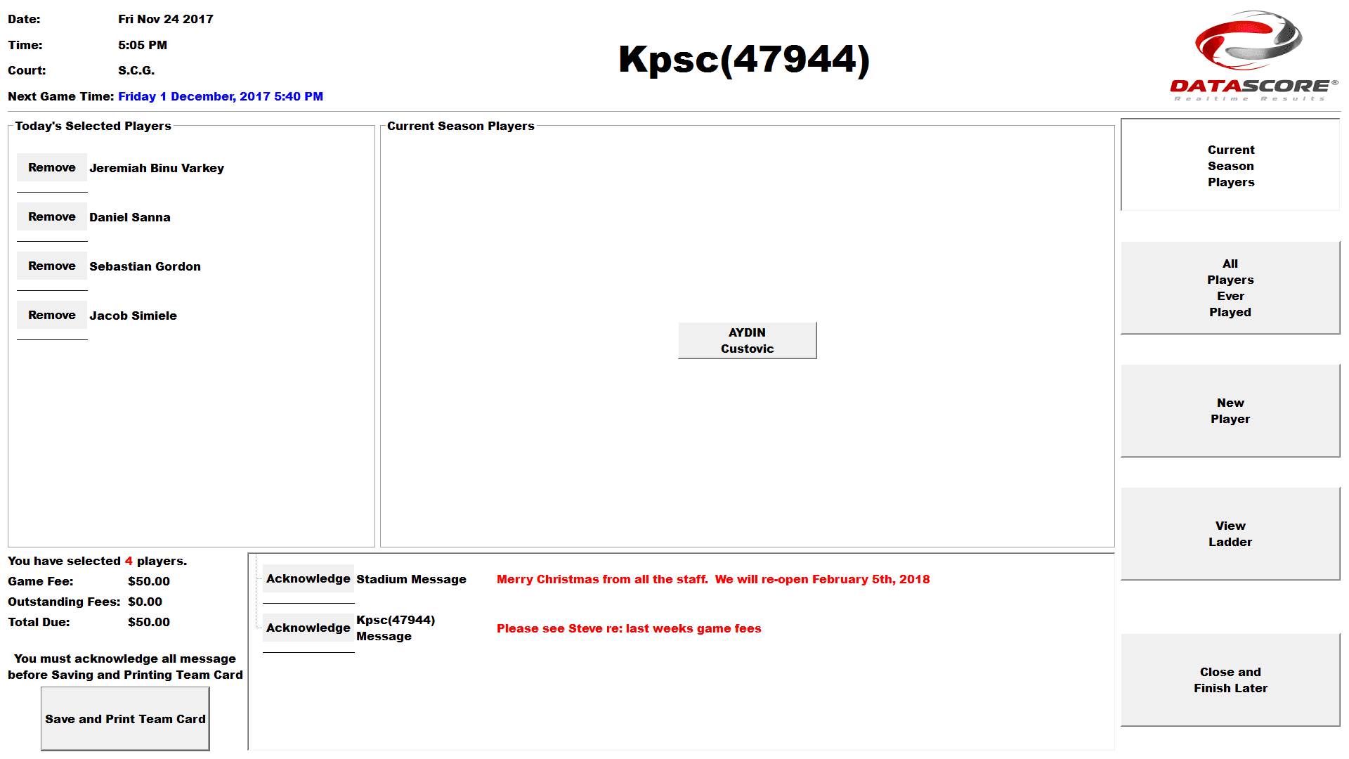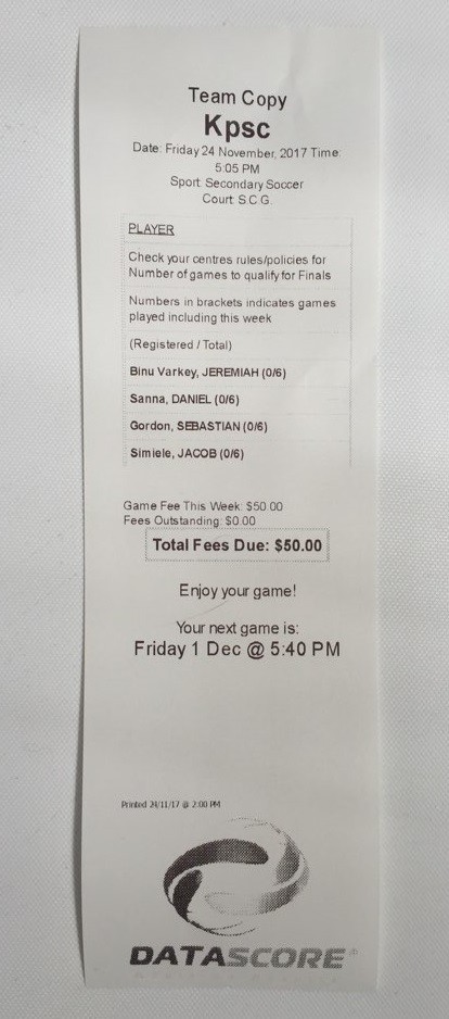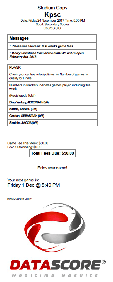 A thermal docket is printed out once the team has successfully checked in. The printout lists the signed in players along with the number of matches they have played over the entire season. Other important information such as outstanding fees, upcoming fixtures and announcements are also presented on the printed docket.