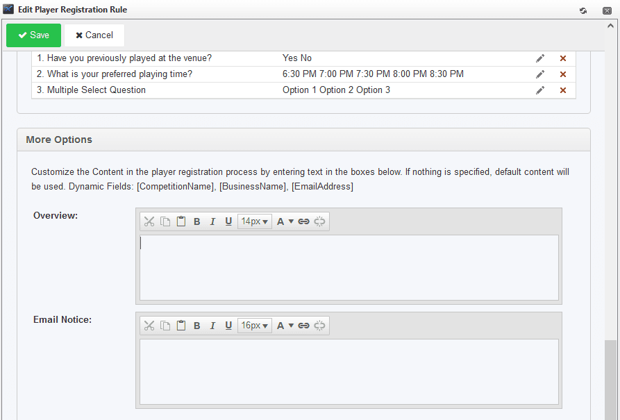 Similar to the team registration overview, the overview displayed for the player registration process can also be changed. In addition, content can be added to the player registration email notice. This content can be accessed in the player registration rule: