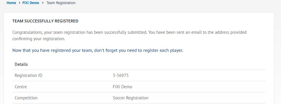Team Registration – Successfully Registered Notice