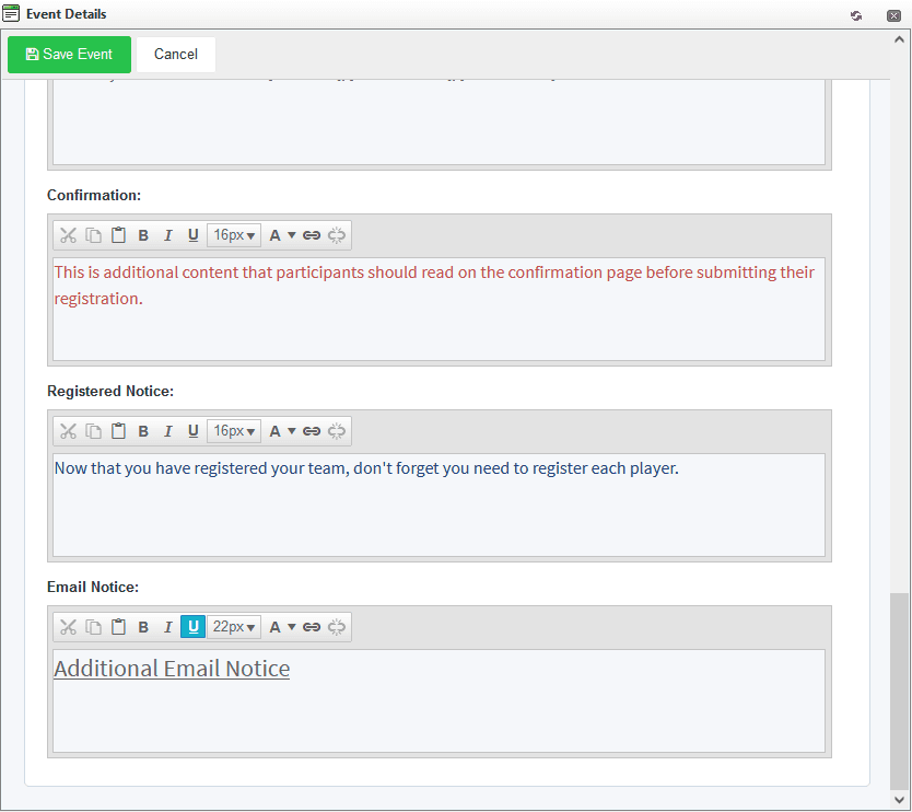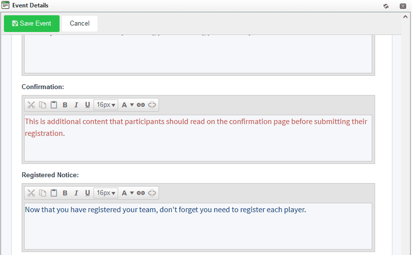 Similar to the additional Confirmation content, the Registered Notice is additional content that can be added to the team successfully registered page. Here is an example:
