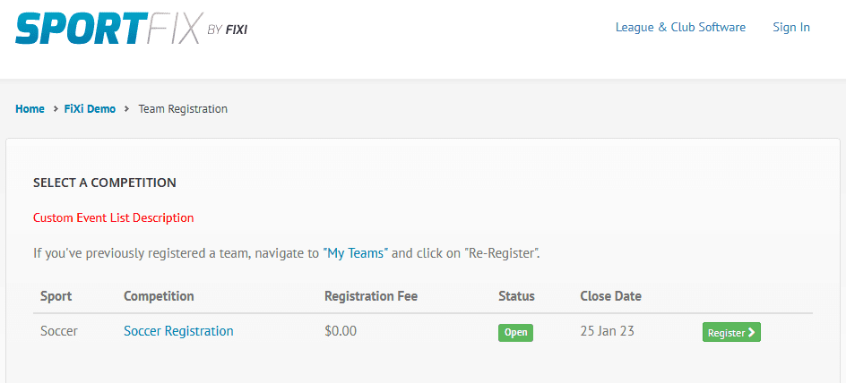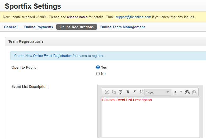 You can change this content by navigating to Sportfix –> Settings, by then clicking on the Online Registrations tab and then adding text to the Event List Description field.