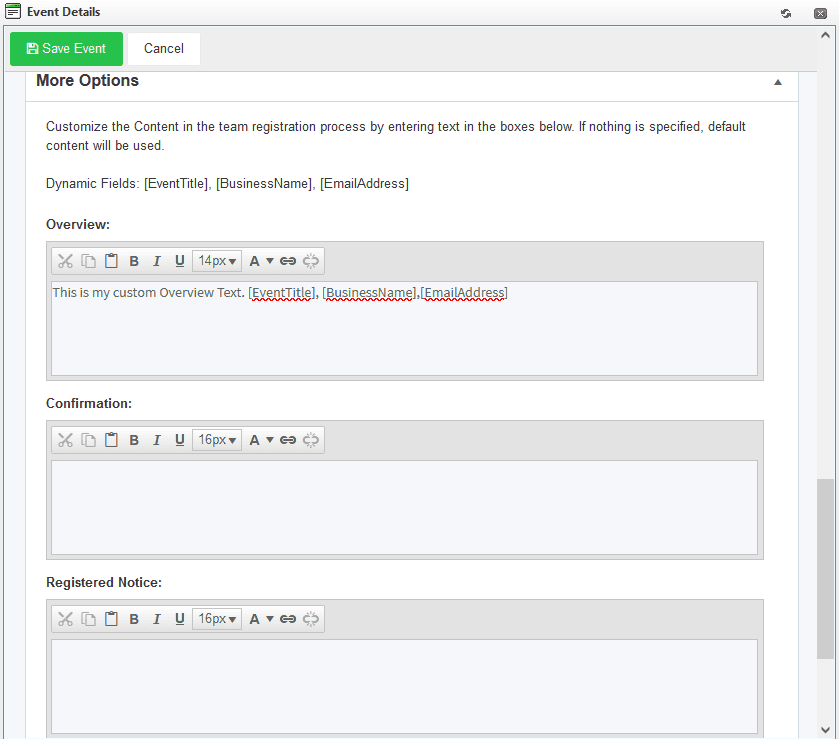 Please note we have included 3 dynamic fields: [EventTitle], [BusinessName], [EmailAddress] which can be used as illustrated above.