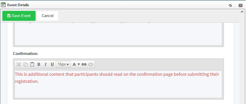 Unlike the above customization options, the “Confirmation” text area box in the Event Details dialog, does not replace text, instead it adds additional content to the team confirmation page. Here is an example: